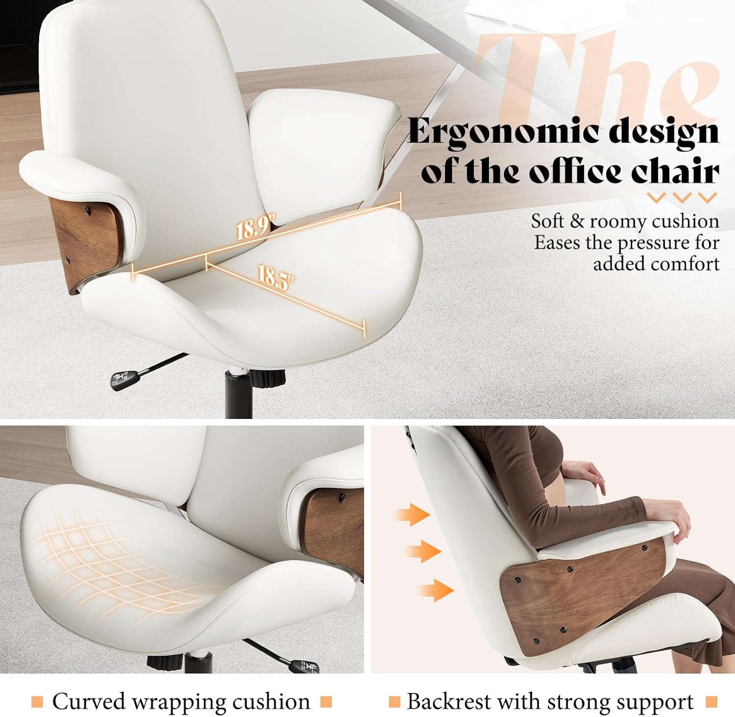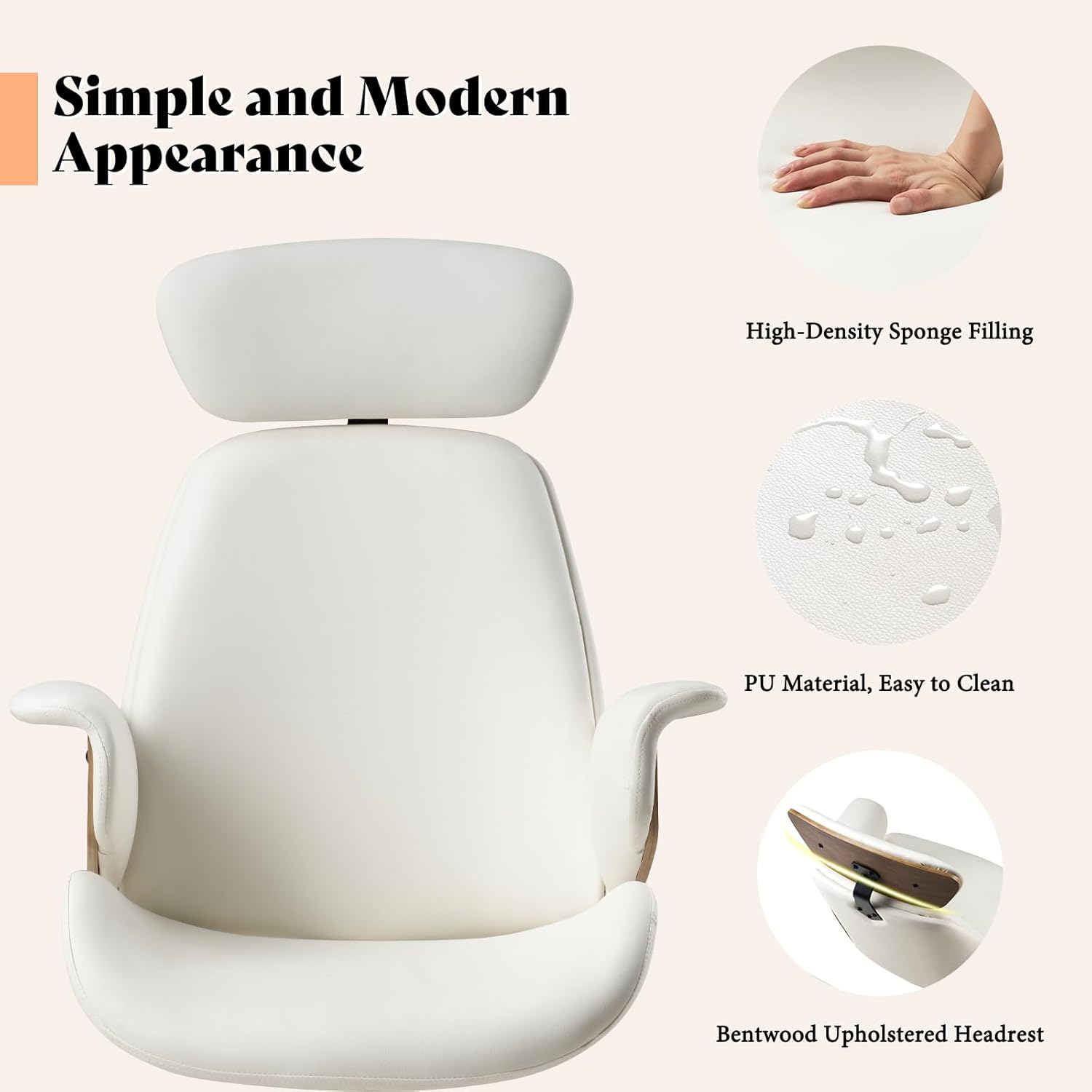 AMERLIFE Home Office Chair with Wheels and Bentwood Arms, PU Leather Swivel Desk Chair with Lumbar Support and Headrest, Height Adjustable Modern Computer Chair for Office, Study, White