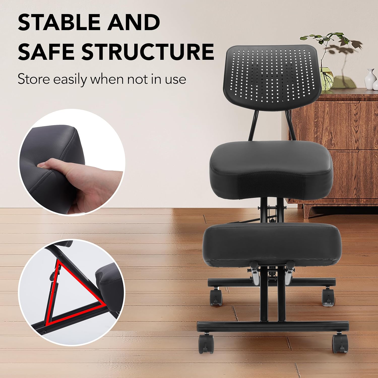Ergonomic Kneeling Chair with Back Support, Kneeling Desk Chair for Home Office with Brake and Gliding Casters, Adjustable Posture Chair with High Back for Desk to Relieve Back Pain, Black PU