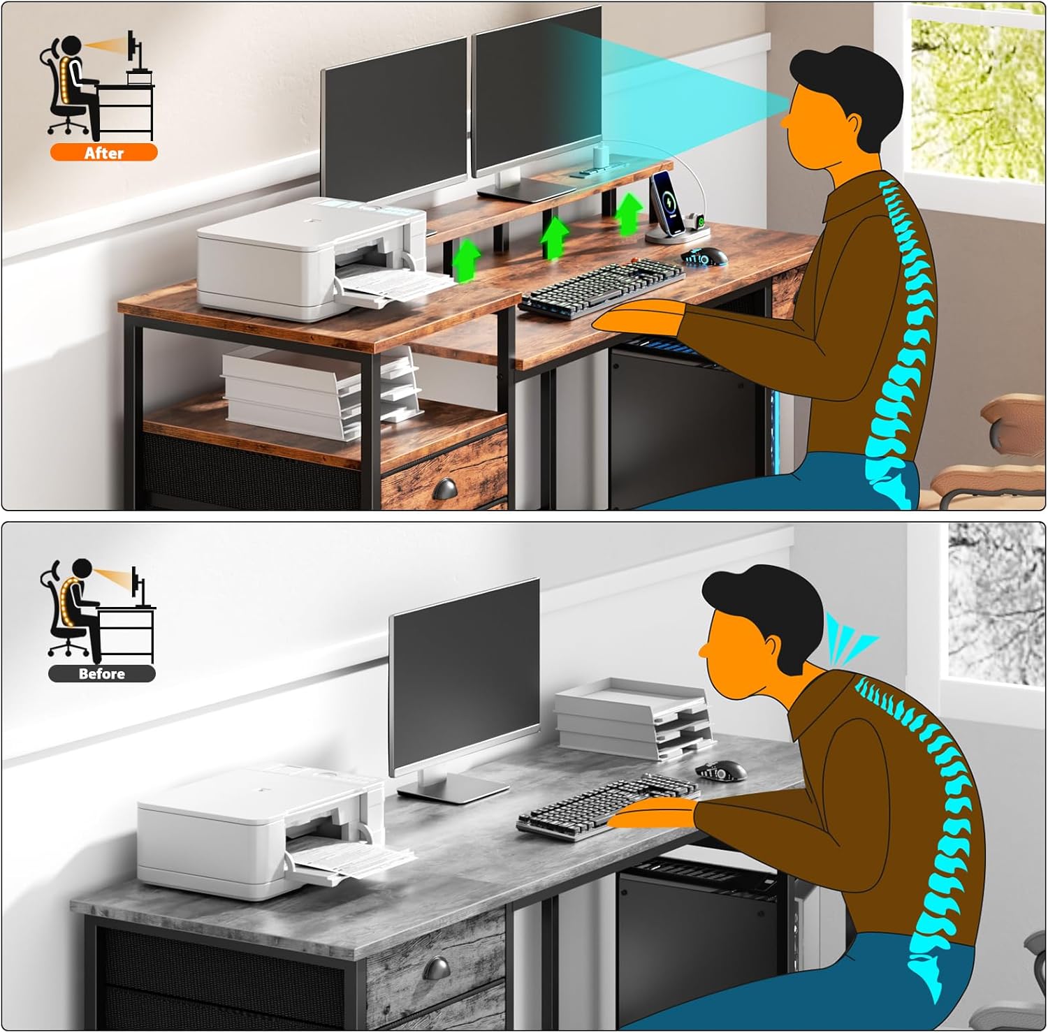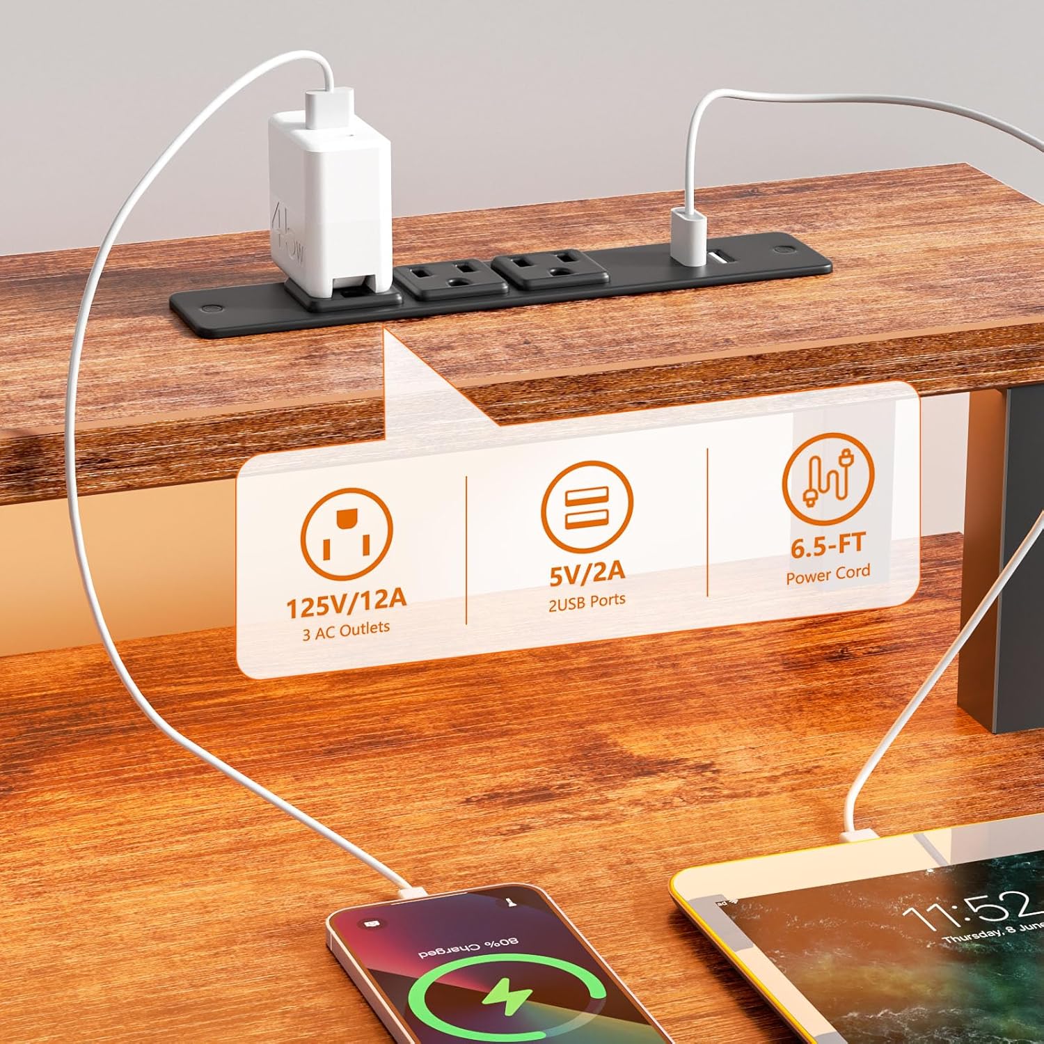 Furologee 60" Office Computer Desk with 4 Drawers,Gaming Desk with LED Lights and Power Outlets,Long Desk with Fabric File Cabinet,Study Work Table with Shelf for Bedroom Home Office,Rustic Brown