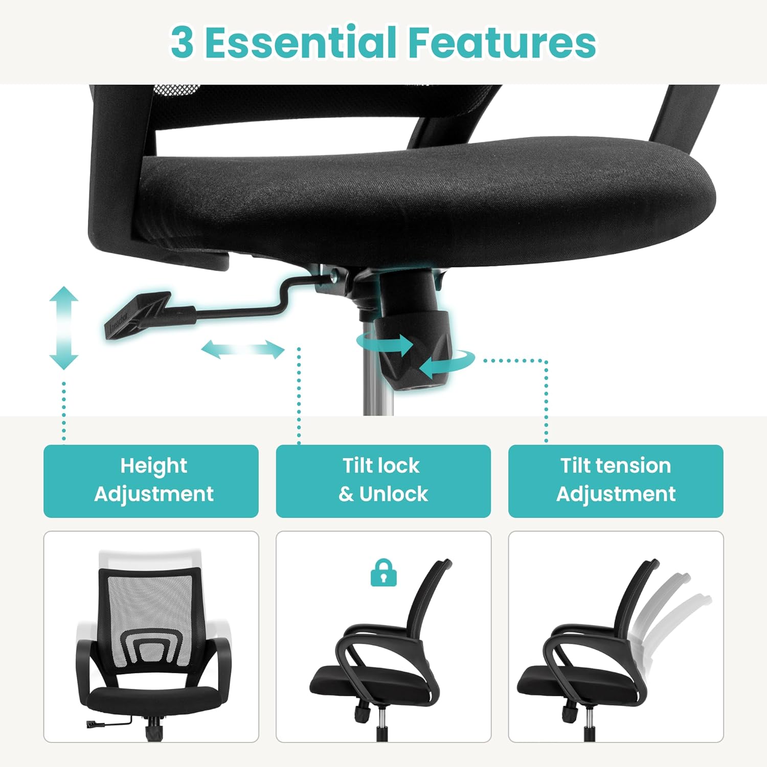 Office Chair with Ergonomic Mid Back Cushion Lumbar Support Adjustable Swivel Rolling Computer Gaming Desk Chair Comfy Mesh Seat Wheels Home Executive Use (1, All Black)